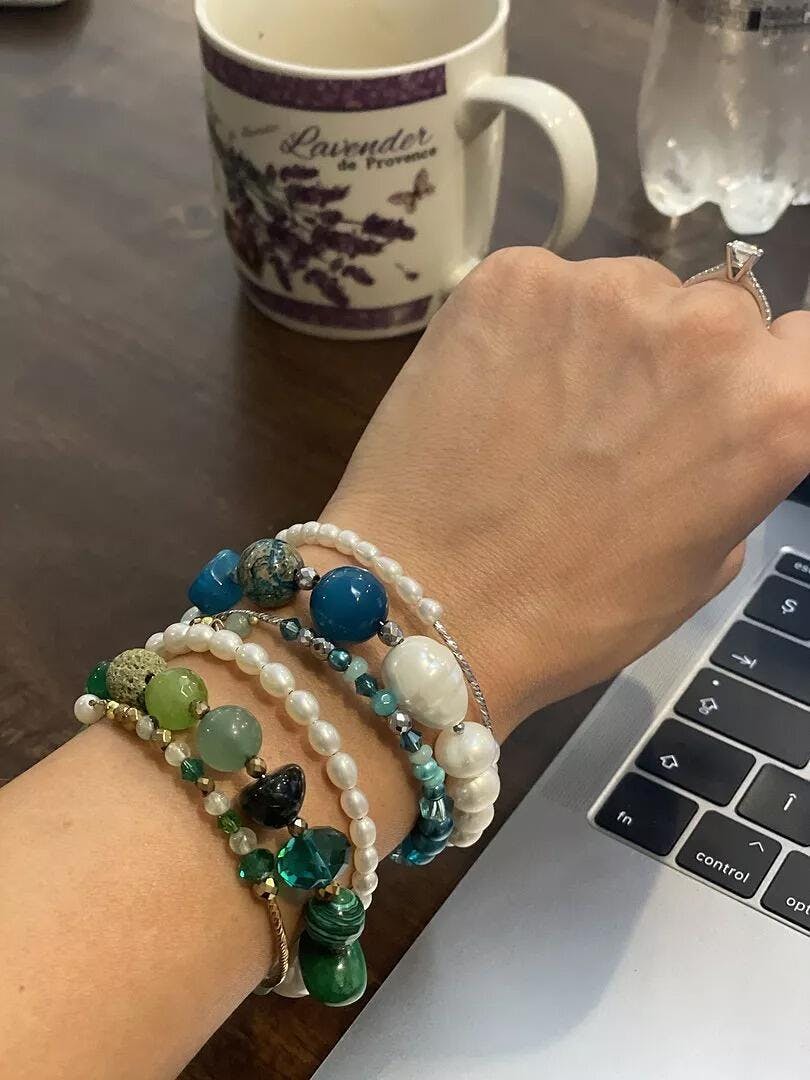 O bratara cu un farmec dual, in care rafinamentul perlelor naturale de cultura se imbina armonios cu stralucirea pietrelor semipretioase, perlelor Mallorca si a cristalelor. Aceasta combinatie ofera o varietate bogata de culori, texturi si straluciri si este expresia echilibrului perfect intre traditie si modernitate, conferindu-i purtatoarei sale o prezenta distinctiva si un farmec inconfundabil.