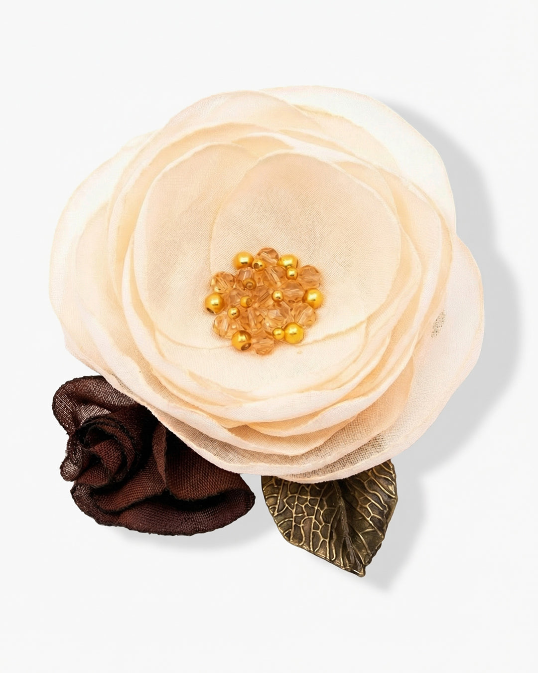Fiecare petala este decupata si modelata manual la flacara pana capata forma dorita. Mai departe, petalele sunt perfect asezate si cusute impreuna cu fir specializat folosind cristale sticla fatetate, margele pietre semipretioase hematit aurii si margele otel inoxidabil aurii. Brosa este finalizata prin atasarea macului, cu rabdare, de suportul accesoriului care are doua optiuni: inchidere cu ac de brosa + inchidere cu clama de par.