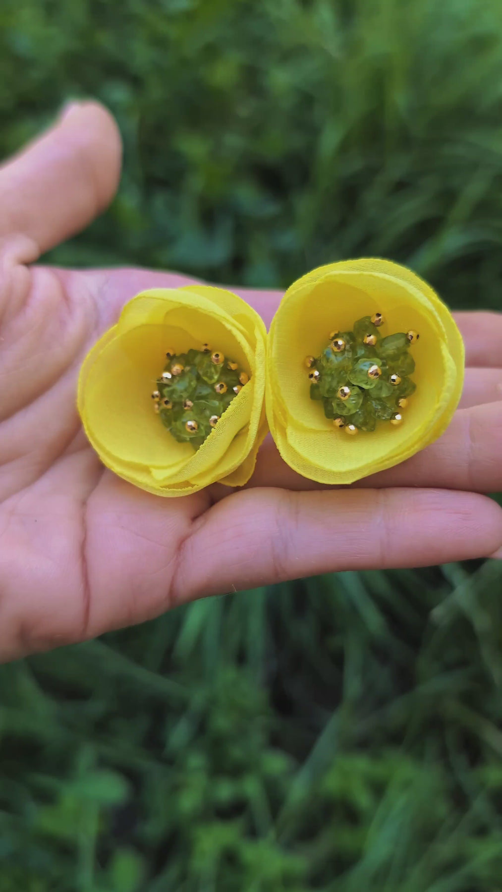 Fiecare petala este decupata si modelata manual la flacara pana capata forma dorita. Mai departe, petalele sunt perfect asezate si cusute impreuna cu fir specializat folosind chipsuri pietre semipretioase peridot. Perechea de cercei este finalizata prin atasarea macului, cu rabdare, de tortita leverback din otel inoxidabil.