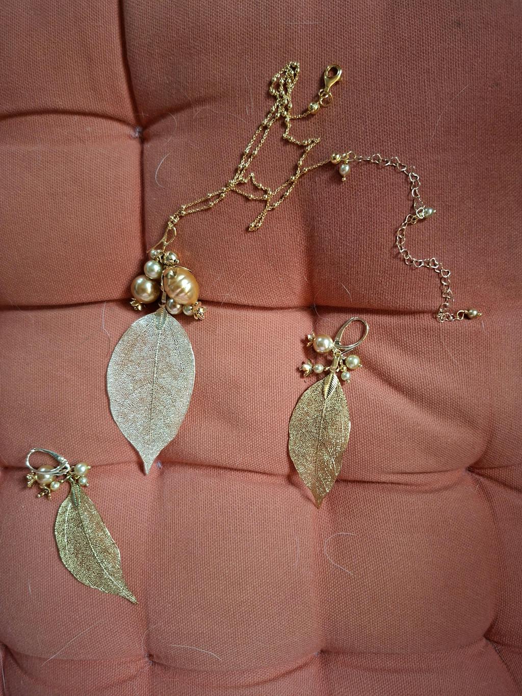 - Elemente Unice: Piesele centrale sunt doua frunze naturale uscate, conservate cu grija prin electroplacare, pastrandu-si autenticitatea si delicatetea. Desi par fragile la prima vedere, frunzele electroplacate sunt foarte rezistente si chiar usor flexibile - create sa dureze.
