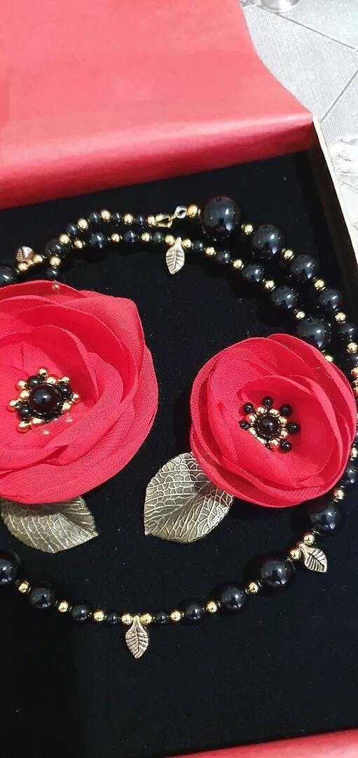 - Colier asimetric floral cu maci rosii