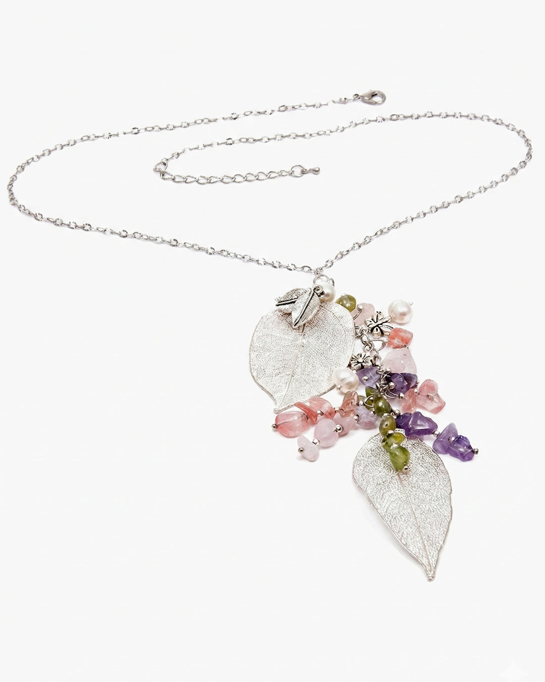 Un colier ce emana eleganta si rafinament, creat pentru a aduce un strop de culoare in garderoba ta. Detalii Unice: Piesele centrale sunt doua frunze naturale uscate, conservate cu grija prin electroplacare, pastrandu-si autenticitatea si delicatetea. Desi par fragile la prima vedere, frunzele electroplacate sunt foarte rezistente si chiar usor flexibile - create sa dureze.