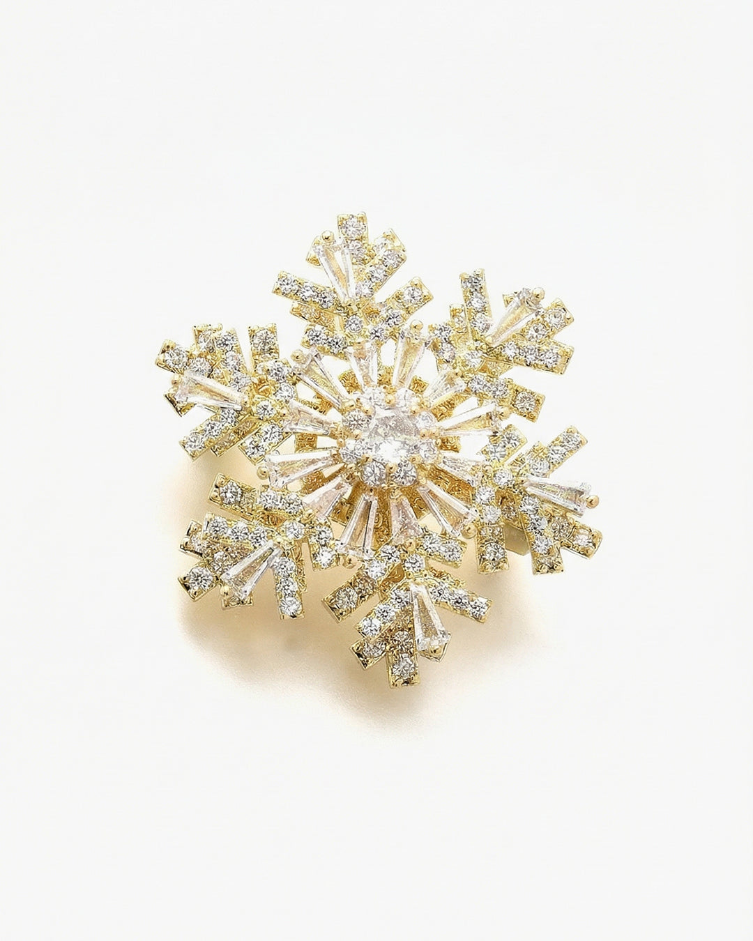 Ca o poezie de iarna prinsa intr-o raza de lumina, aceasta brosa in forma de fulg de nea imbina eleganta clasica cu magia miscarii. Realizata din alama si impodobita cu cristale zirconia stralucitoare, nu este doar o bijuterie – este o amuleta a calmului, o invitatie la joaca si rafinament.