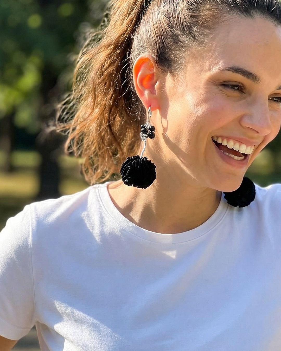 Cerceii papadie Dark Pom Pom imbina gratia pietrelor semipretioase de onix cu delicatetea florilor, adaugand un strop de natura oricarei tinute. Perfecti pentru a adauga un accent inedit fie ca esti in oras cu prietenii sau la un eveniment important.
