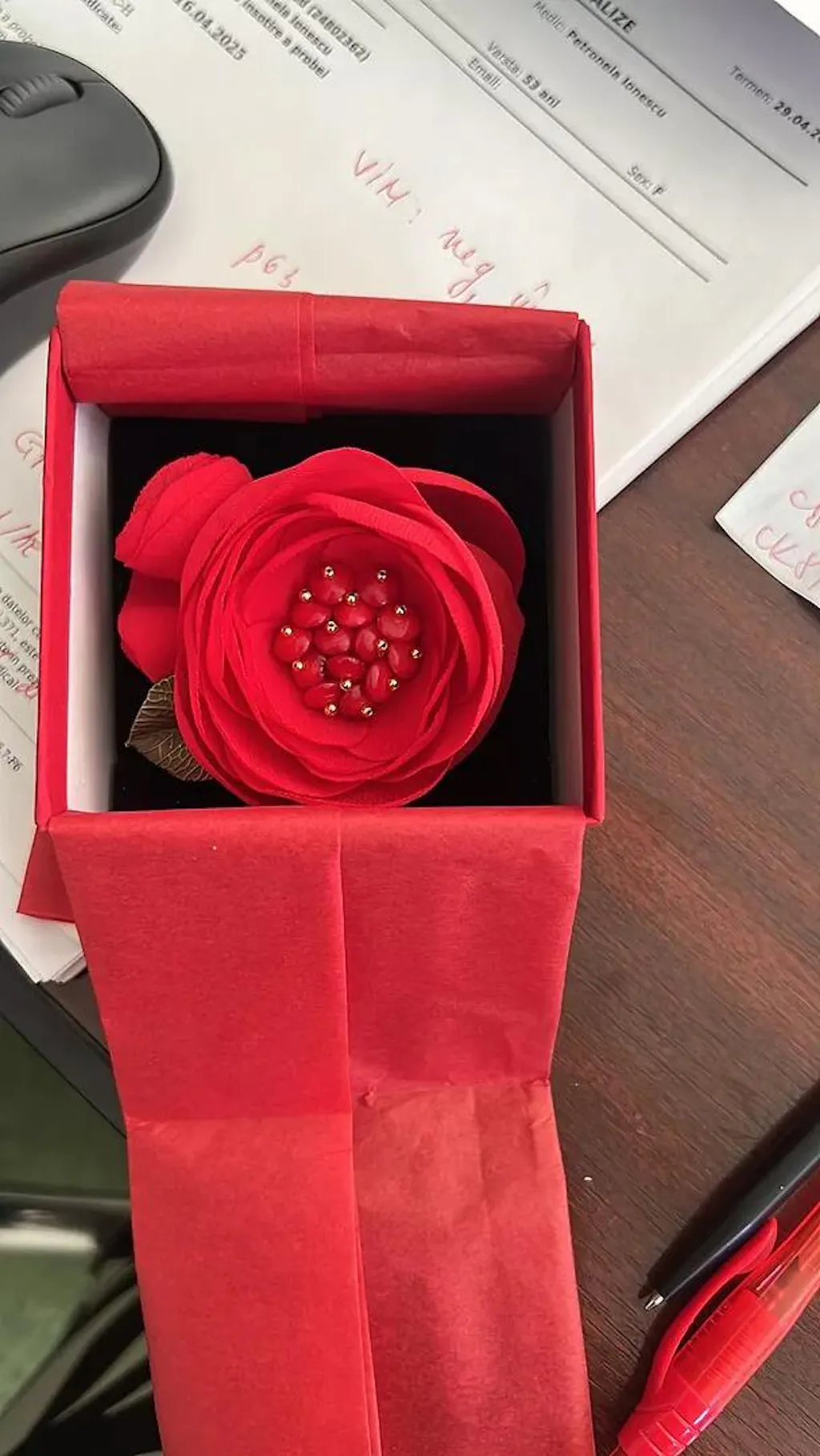 Un mac rosu care se prinde si pe bluza, si in par. Poart-o la birou pe sacou, pune-o in par pentru o iesire sau prinde-o pe palton cand vrei o pata de culoare. Doua sisteme de prindere (ac de brosa + clama de par) iti dau libertate totala.